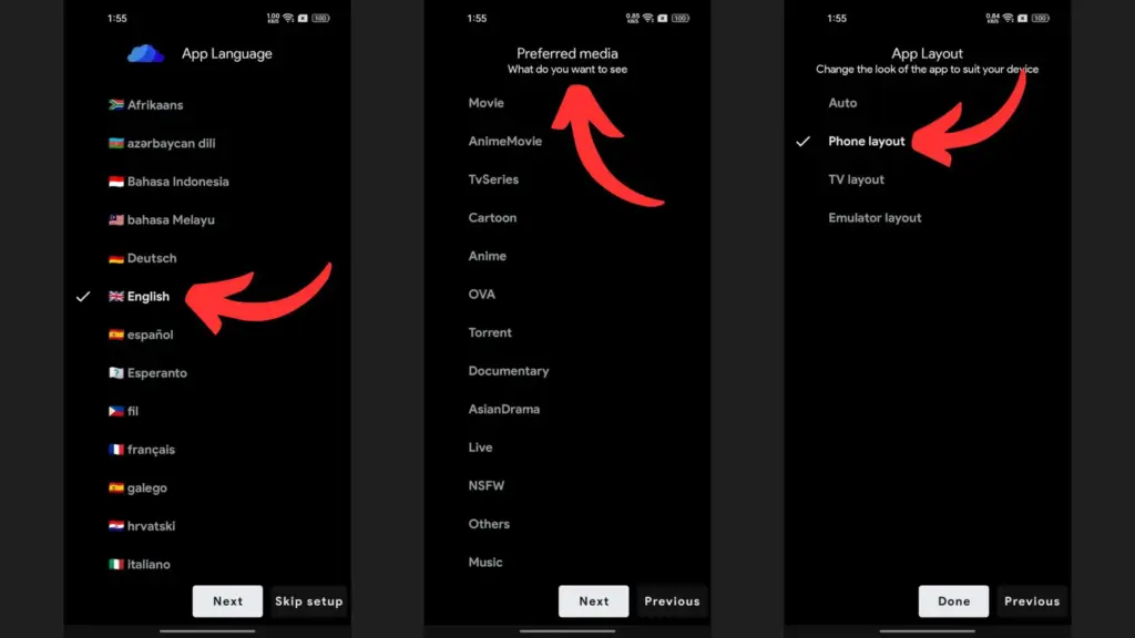 - You will need to choose the language for the app interface and also your favorite type of media such as movies or anime.
